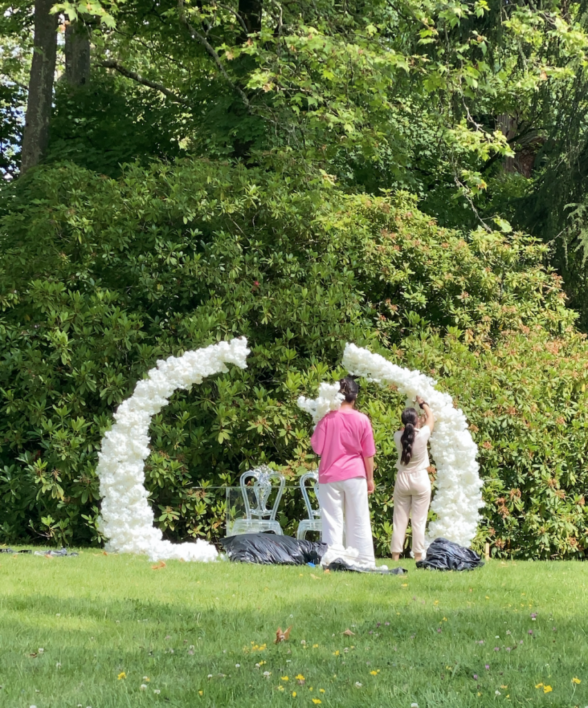 Ici, je prépare le coin dédié aux mariés qui se déroulait au sein des jardins d’un château. Leur souhait était une décoration simple et épurée, sublimant ainsi l’élégance naturelle du lieu. C’était magnifique !
