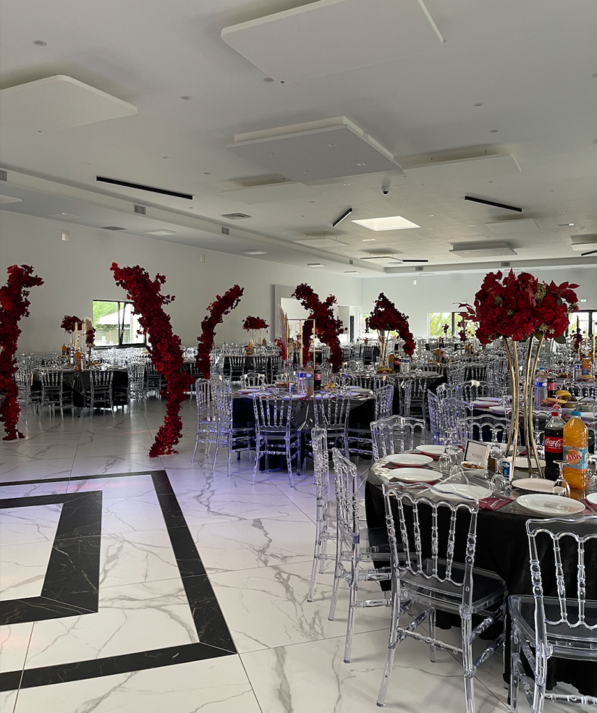 Voici une décoration de salle très élégant : thème rouge/bordeaux.