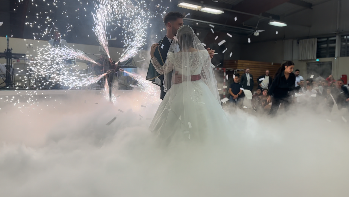 Voici la première danse des mariés. La fumée et les jets de scène rendent le moment extraordinaire et féérique. Nous pouvons m’apercevoir sur le côté en train de gérer la machine à fumée.